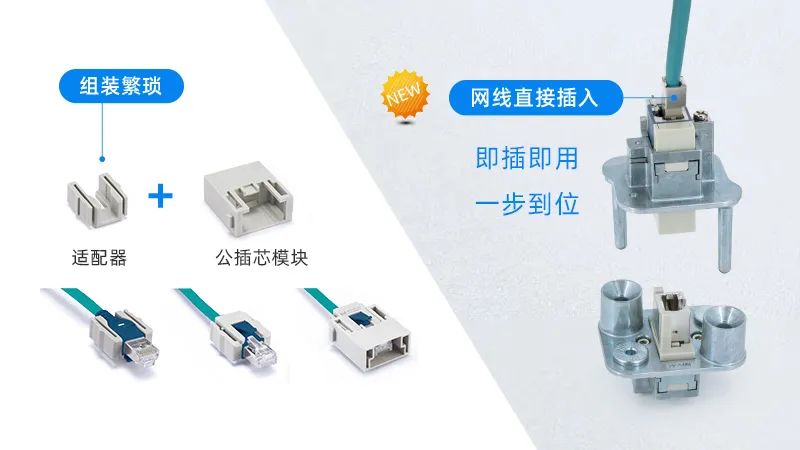 原有的RJ45公插芯模块,需额外选择适配器进行组装电缆,再搭配公插芯模块,组装过程繁琐,所需配件多,而全新的公转母RJ45模块,可实现即插即用,一步到位的功能。