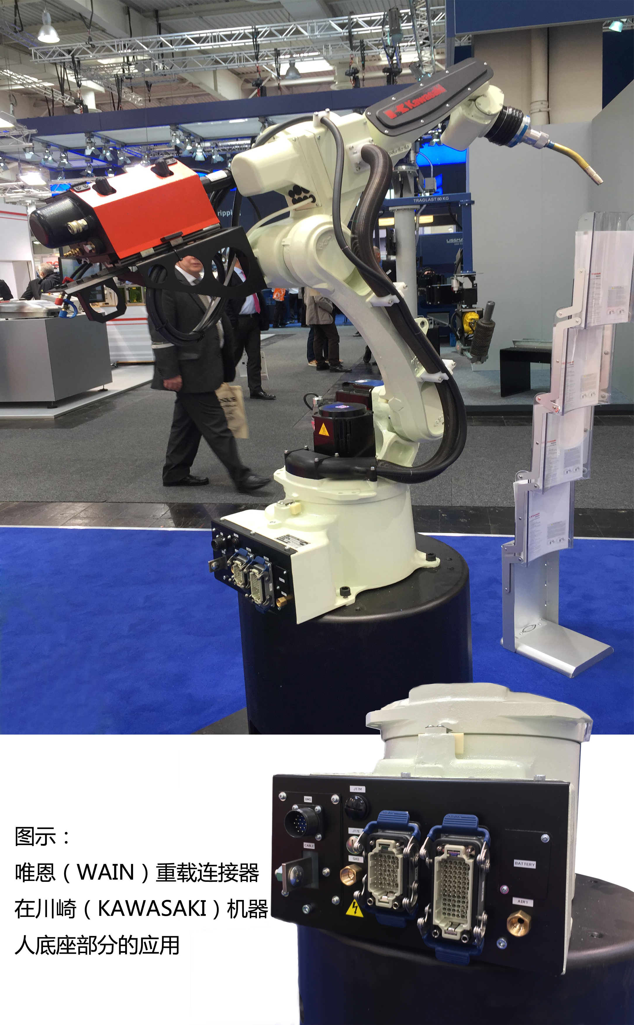 川崎(KAWASAKI)机器人以高度的综合技术实力,以提供高功能,高质量,高安全性的产品以及服务为使命,得到社会广大顾客的高度信赖,主要行业有点胶、点焊、弧焊、装配、汽车生产流水线、码垛、涂装、搬运、上下料、分拣等等。而此次2015 HANNOVER 德国汉诺威展会上,川崎机器人不仅展示了码垛、搬运、点焊机器人等,更展示了唯恩(WAIN)重载连接器在川崎(KAWASAKI)机器人上的应用,通过川崎机器人已有的25年成功经验,选择唯恩(WAIN)重载连接器作为他们的长期合作伙伴,是对唯恩(WAIN)品牌的认可。