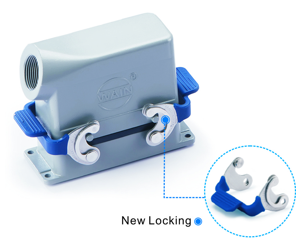 WAIN研发的SC系列锁扣装置,采用高强度不锈钢一体式设计,完全避免断裂的可能性,即使在恶劣的环境下长年使用,也可确保其功能完整。锁扣主体一体成型,且在主体两外侧设置弹性件用于锁紧插头与插座部分,弹性件采用月牙形弹性件,外观独特,结构巧妙;优质的NBR包胶材料,手柄部的手感更好;在锁扣的过程中滚轮结构能使之锁扣得更顺畅。一种连接器锁扣结构已取得实用新型专利,专利号为201420344473.9。作为矩形连接器外壳锁扣装置,SC系列产品可广泛应用于轨道交通、电力控制柜等行业。