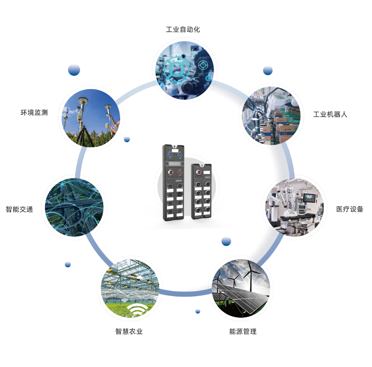 WAIN IO-Link可以应用于各种工业领域(如自动化、机器人、制造业、物流、医疗设备等)、能源管理、智能家居、智慧农业、智能城市、智能交通、环境监测等,实现对设备的实时监测、诊断和控制。
