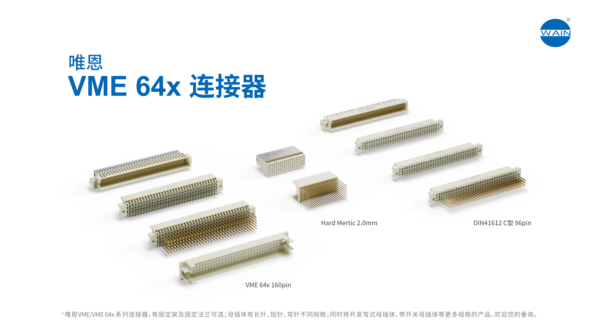 WAIN配备多款板载连接器,近期新品VME 64x连接器支持高达320Mb/s的数据传输速率,应用在工业控制、军事系统、航空航天、轨道交通、医疗设备及半导体制造等行业。